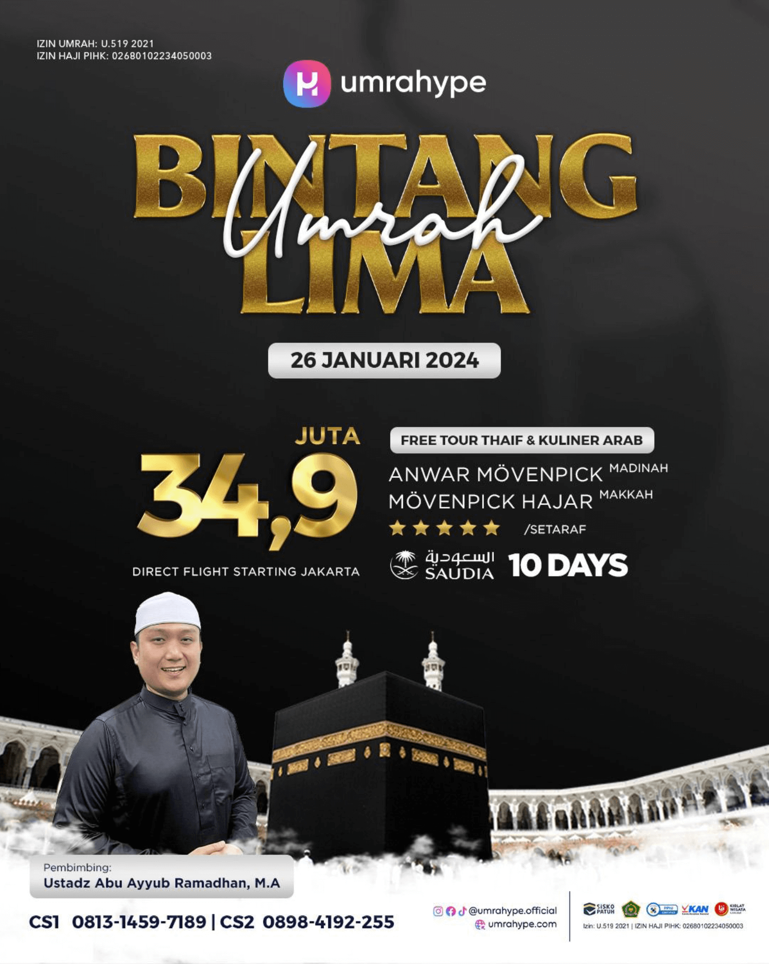 Paket Umrah hotel bintang 5 plus ziarah kota Thaif dengan pesawat Saudia Airlines.
