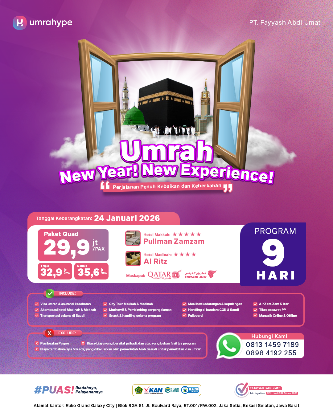 Pendaftaran baru dan batas pelunasan paling lambat satu bulan sebelum tanggal tiket keberangkatan,